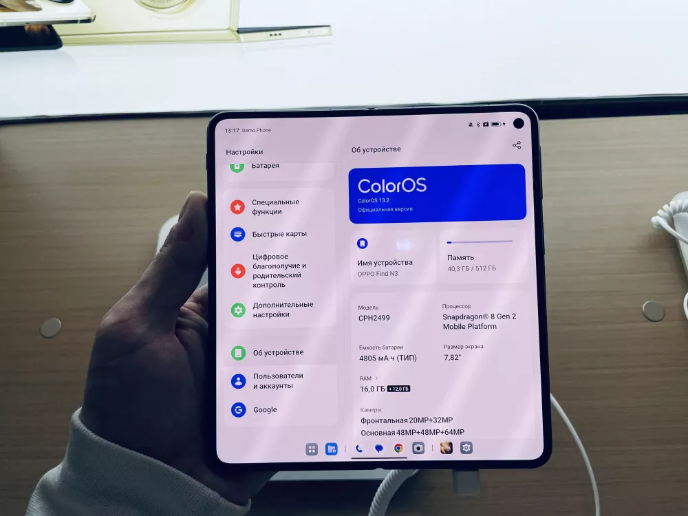Сразу хочется отметить, что место сгиба заметно только при очень пристальном рассмотрении. Без этого никуда — законы физики пока не отменили. Фирменная оболочка ColorOS работает шустро. Чтобы ее протестировать в смартфоны уже были предустановлены ряд популярных приложений и игр, включая требовательную Genshin Impact. Главным достижением стала новая версия шарнира, которая по словам разработчиков выдерживает до 1 миллиона складываний и благодаря инновационной конструкции сводит к минимуму искажение в центре дисплея. Первое визуально-тактильное впечатление о новинках сложилось исключительно положительное. Подробнее о технических характеристиках моделей OPPO Find N3 Series мы расскажем в отдельном материале.