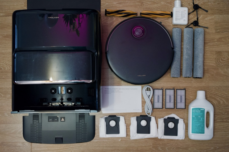 Комплект поставки Trouver Z60 Ultra Roller впечатляет. В коробке: сам робот-пылесос, станция самоочистки, инструкция, две дополнительных основные щетки, две дополнительных боковые щетки, три мешка для мусора, три дополнительных роликовых швабры, чистящее средство, средство для устранения запаха от домашних животных и три HEPA-фильтра. Если честно, я уже и забыл, с какими моделями видел такую же комплектацию. За такой подход бренд получает от меня первый лайк.