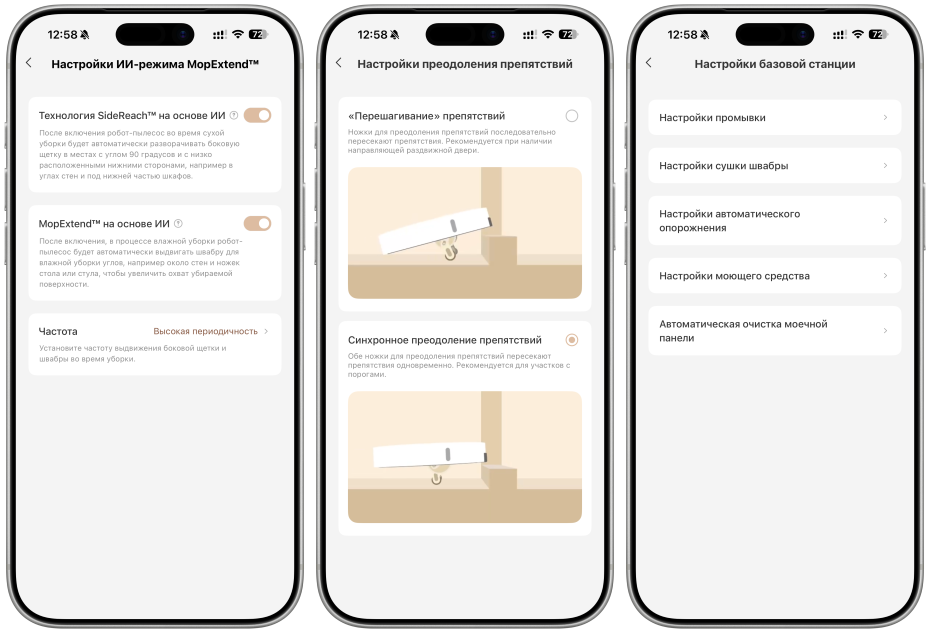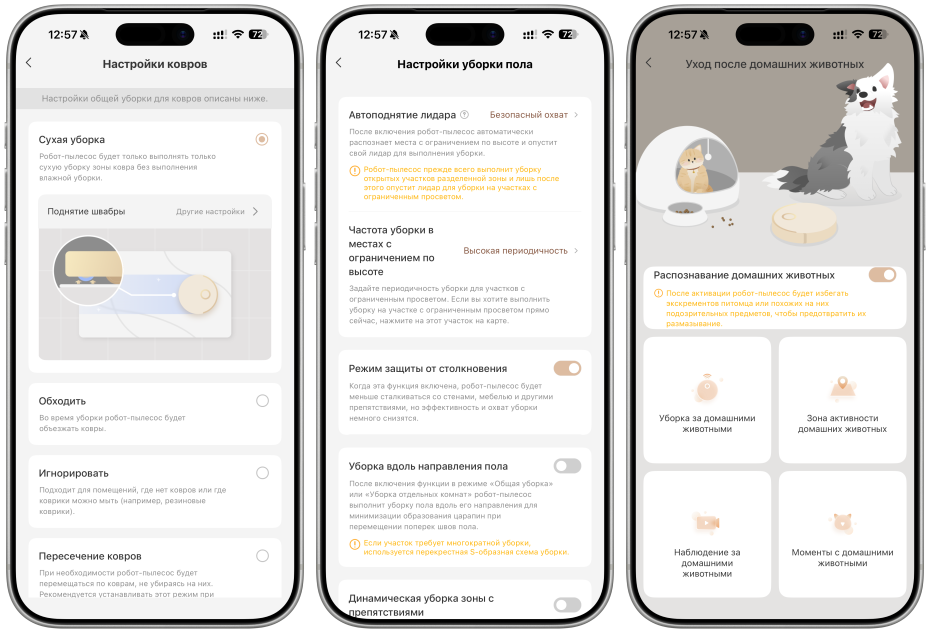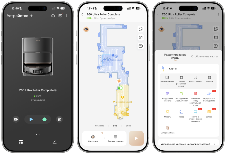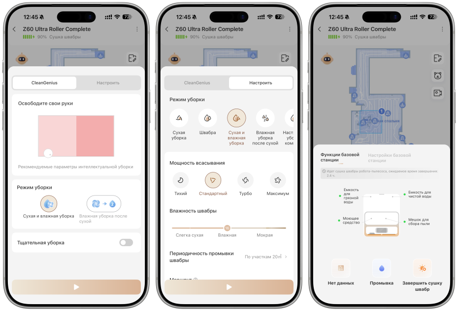 Также в приложении можно настраивать уборку (режим, мощность всасывания, уровень влажности, маршрут и тд) и работу станции.