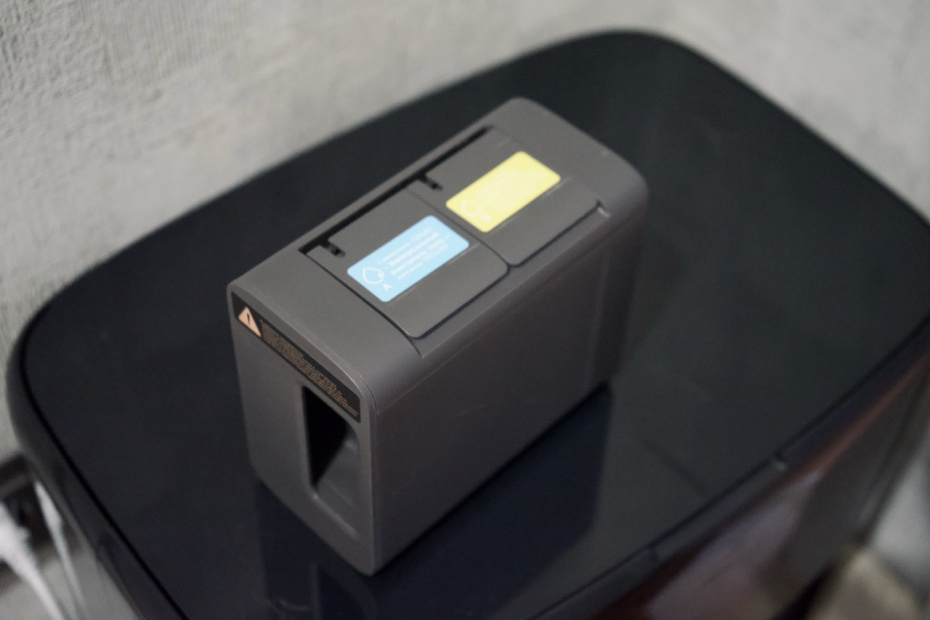 Объем бака для воды в самом роботе составляет 0,11 л для чистой и столько же для отработанной. Это «буферные» емкости, которые постоянно пополняются и опорожняются на базе. Это позволяет швабрам всегда оставаться чистыми в процессе уборки, а не размазывать грязь из первой комнаты по всей квартире.