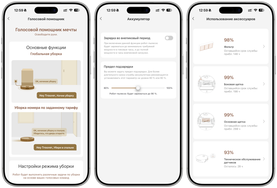 - Информация об использовании аксессуаров — приложение подскажет, когда заменить фильтр, боковую щетку и прочие расходники