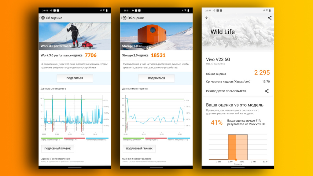 В целом у vivo V23 достойный запас производительности для всех повседневных задач. Интерфейс работает плавно. Игры запускаются и работают на максималках — протестировал смартфон в самых актуальных тайтлах, среди которых PUBG Mobile и Genshin Impact. Что касается тротлинга, он почти отсутствует, об этом говорят показатели CPU Throttling Test.