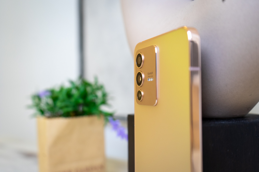 На спинке vivo V23 в левом верхнем углу расположена площадка модуля камеры. В ней вертикально разместились объективы, а чуть правее от них вспышка. В нижнем углу переливается логотип бренда.