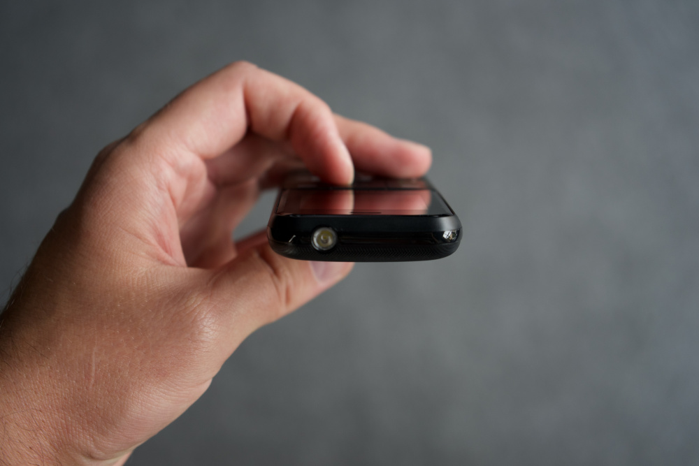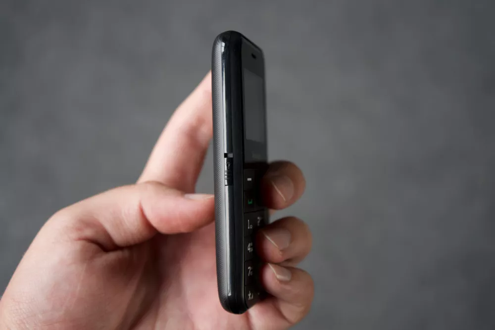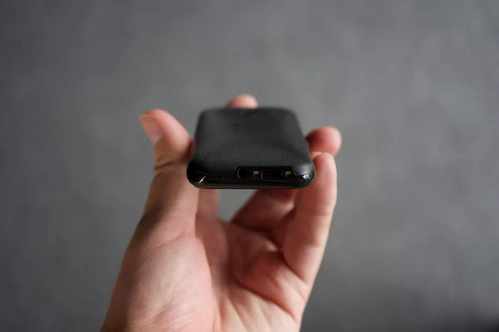На верхнем торце расположен фонарик, а на левой грани — переключатель для его включения. На нижнем торце — контакты для зарядной док-станции, разъем USB-C, а также 3,5 мм аудиопорт для подключения проводных наушников. Xenium X718 — классический моноблок, который, к слову, получился довольно компактным.