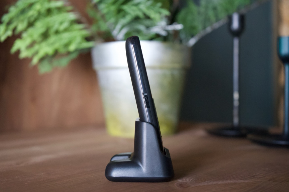 Док-станция для зарядки гаджета также выполнена в черном цвете. Сзади у нее имеется разъем USB-C. Мобильный телефон устанавливается в док-станцию без усилий. Комплектная док-станция упрощает зарядку — просто опустите в нее телефон, и он начнет заряжаться. А еще аксессуар расширяет сценарии использования гаджета. С помощью дока мобильный телефон можно превратить в «стационар» для использования дома или в офисе для звонков.