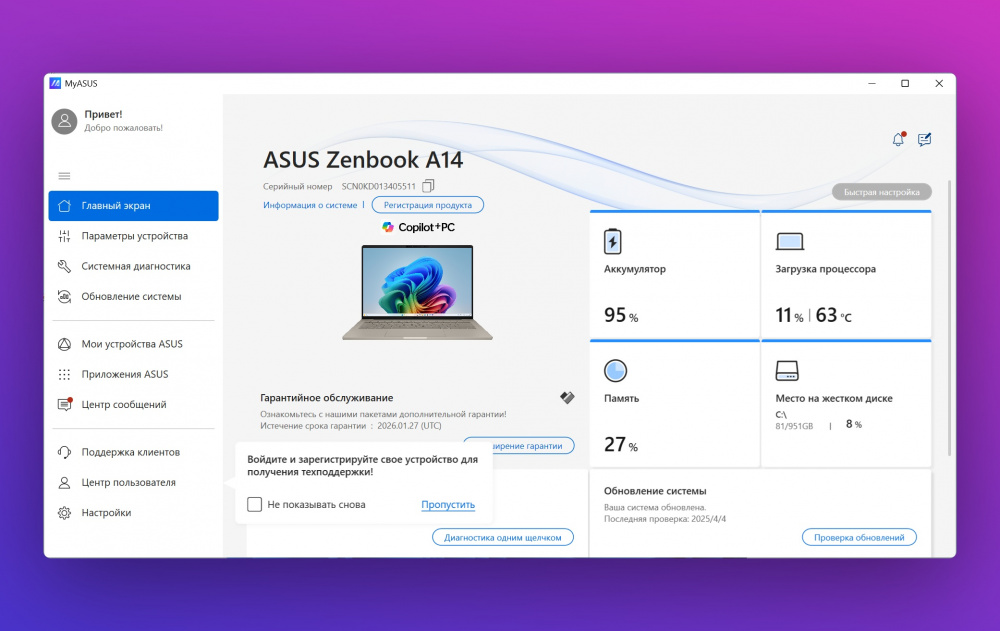Из коробки на Asus Zenbook A14 установлена Windows 11 «Домашняя». Набор программного обеспечения от бренда:- MyASUS — фирменная утилита для настройки и мониторинга работы компонентов системы