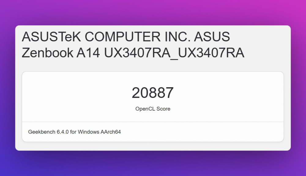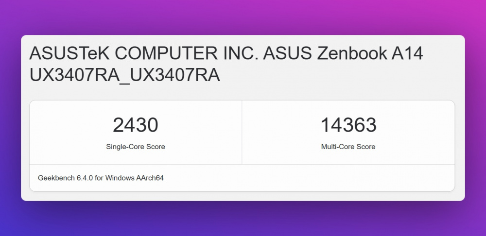 В качестве аппаратной платформы Asus Zenbook A14 получил процессор Snapdragon X Elite X1E-78-100 (42 МБ кеш-памяти, до 3,4 ГГц, 12 ядер, 12 потоков) с ИИ-ускорителем Qualcomm Hexagon (до 45 TOPS). В нашей тестовой конфигурации 32 ГБ оперативной памяти типа LPDDR5X накопитель M.2 NVMe PCIe 4.0 SSD на 1 ТБ.