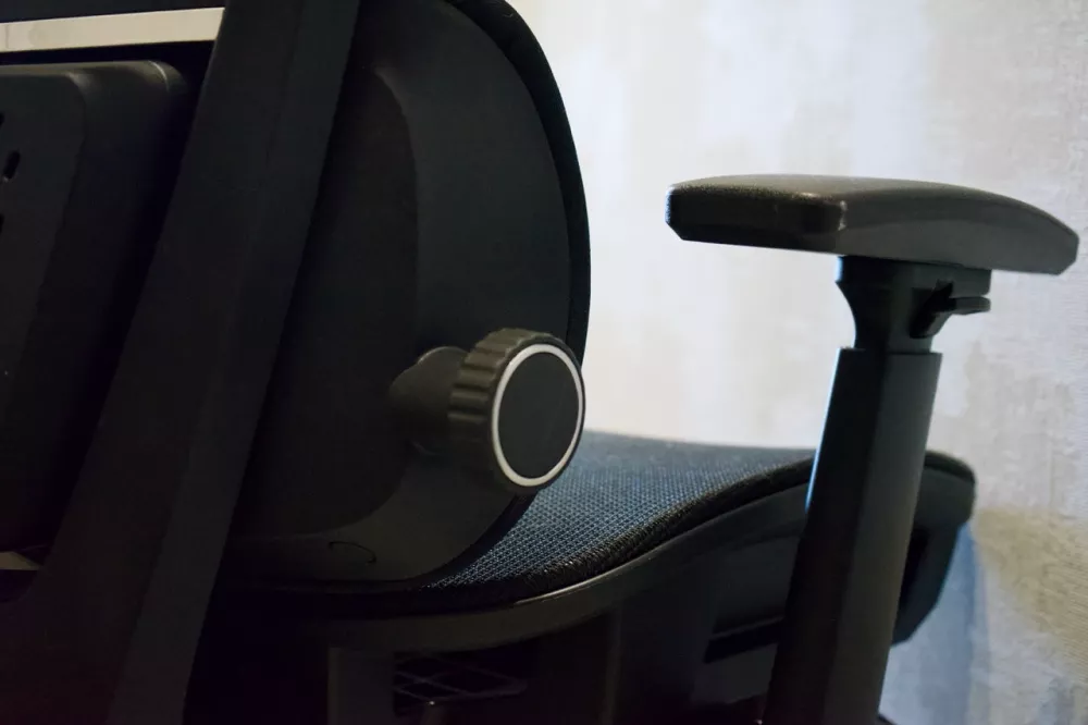 Одна из самых интересных фишек — в валик для поясницы встроен массажер и обогреватель. Эта штука работает от встроенного аккумулятора емкостью 5000 мАч. Массажер работает в двух режимах мощности и позволяет неплохо размять поясницу в конце рабочего дня. Для включения и переключения режимов слева размещены три клавиши и зарядный порт USB-C. Функция обогрева может быть полезна в межсезонье, когда отопление еще не включили.
