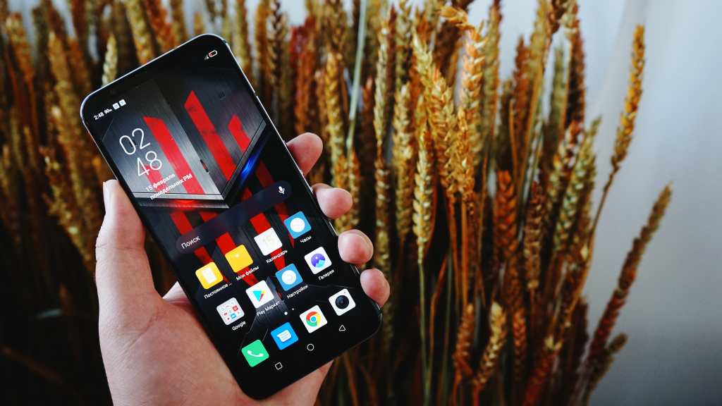 На верхнем торце смартфона имеется разъем 3,5 мм для подключения проводных наушников. На нижнем торце: слот для двух SIM-карт, отверстие микрофона, порт USB-С и решетка динамика. Устройство довольно массивное, но по этому поводу не стоит особо переживать, учитывая принадлежность к геймерской линейке, а это в свою очередь предполагает, что большую часть времени оно будет использоваться в ландшафтном режиме двумя руками. Все элементы конструкции отлично подогнаны, клавиши с приятным ходом, поэтому возникает ощущение надежности. За безопасность устройства отвечает подэкранный сканер отпечатка пальцев.