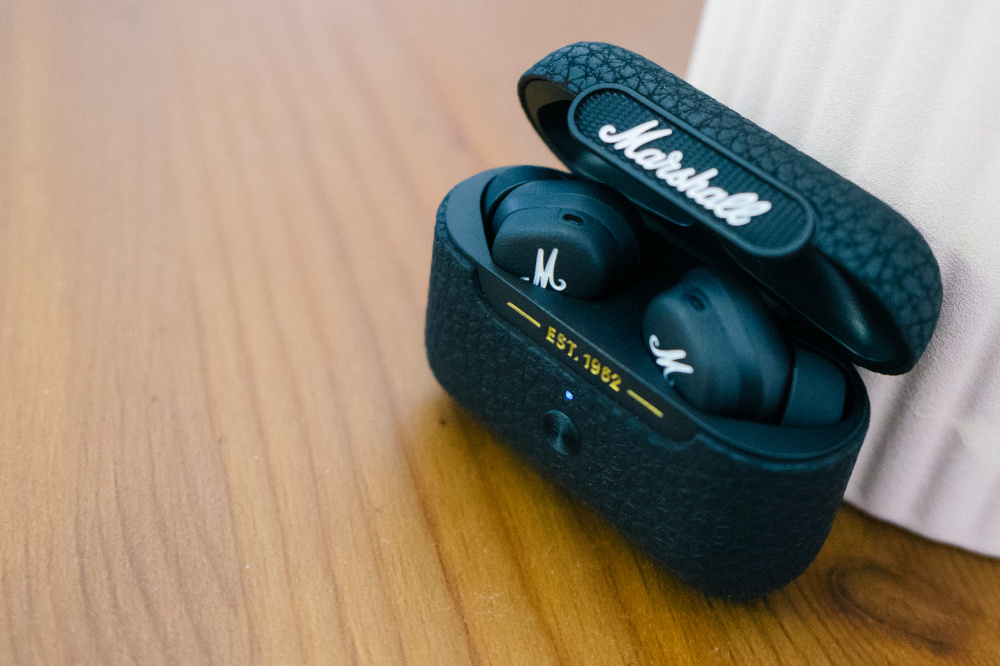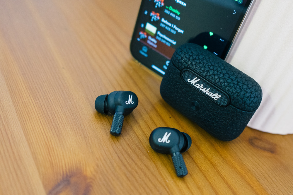 Форм-фактор кейса напоминает AirPods Pro. Он такой же компактный и почти не ощущается в кармане. На нижнем торце размещен порт для зарядки USB-С. Под табличкой с логотипом Marshall расположены индикатор состояния и кнопка сопряжения с очень приятной текстурой. Также стоит отметить, что под спинкой кейса помещены контакты для беспроводной зарядки по стандарту Qi.