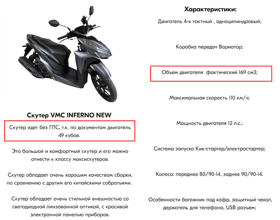 Пикабушник Skrepka1986 обнаружил на Ozon скутер VMC Inferno 170CC. В карточке товара указано, что этот транспорт не требуется ставить на учёт в ГАИ. Это значит, что на нём можно ездить без регистрационных номеров, а в случае нарушения правил дорожного движения его владельцу ничего не грозит.