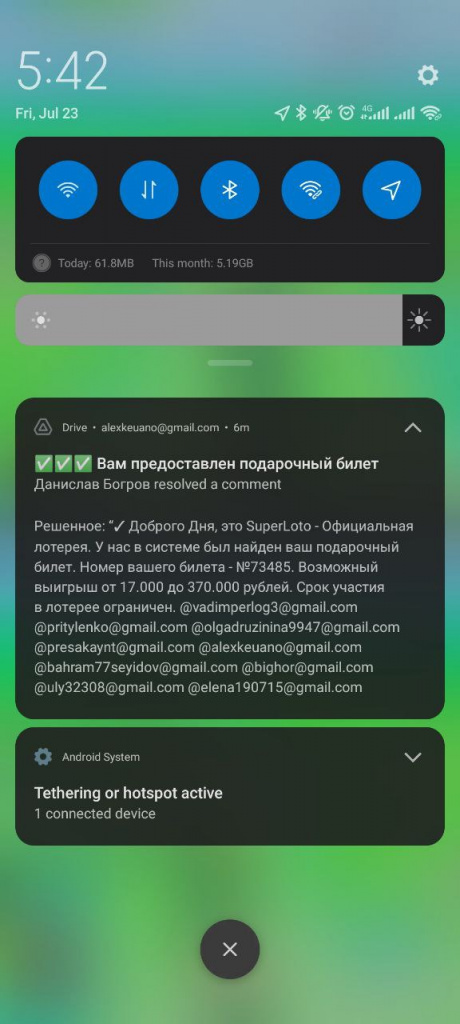 В последние несколько месяцев спамеры не дают спокойно жить пользователям Android — они заваливают их спамом через Google Drive (он же «Google Диск»). Всем, чей адрес почты в домене gmail.com выложен в открытый доступ, периодически приходят сообщения о возможности получить выплату, выигрыш и нечто подобное, причём спамеры спамят через уведомления «Google Диска», от которых невозможно избавиться. Впрочем, решение всё же найдено.