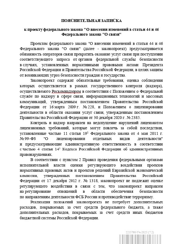 Государственная дума РФ начала рассмотрение законопроекта, расширяющего полномочия органов безопасности в сфере связи. Документ предполагает внесение изменений в статьи 44 и 46 Федерального закона «О связи». Согласно проекту, операторы связи будут обязаны выполнять требования ФСБ о прекращении оказания услуг. Основанием станут угрозы безопасности граждан и государства, определяемые указами президента и правительства.