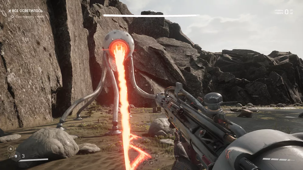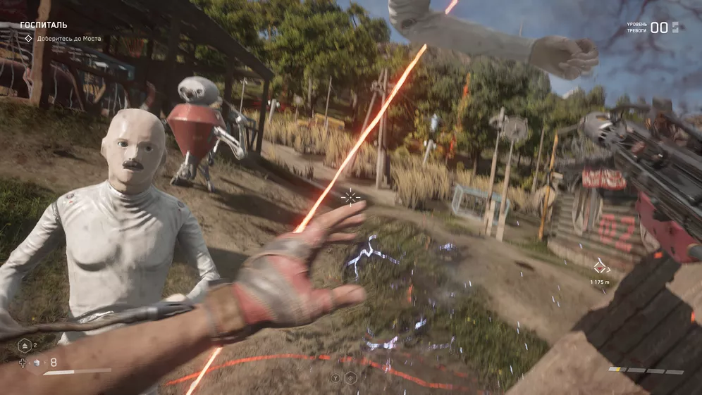 Напомню, в Atomic Heart главного героя сопровождает перчатка-компаньон по имени ХРАЗ — по ходу игрового процесса он «развлекает» майора беседами, а также выполняет базовые механики. Взаимодействие с этим «напарником» со стороны чем то напоминает общение стража с призраком из Destiny. ХРАЗ используется для навигации по игровому миру, сканирования объектов, сбора полезных предметов и применения способностей. Навигация (карта) доступна только в режиме открытого мира — сюжетные объекты придется исследовать и запоминать. Для сканирования территории Нечаев делает специальный жест, после чего начинают подсвечиваться полезные предметы и противники. При детальном сканировании последних ХРАЗ выдаст информацию об их уязвимостях.