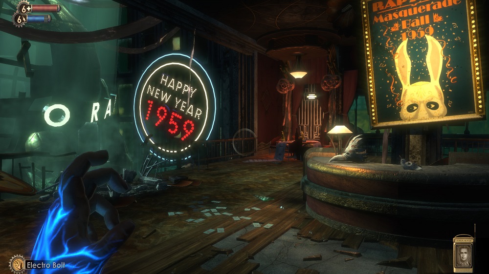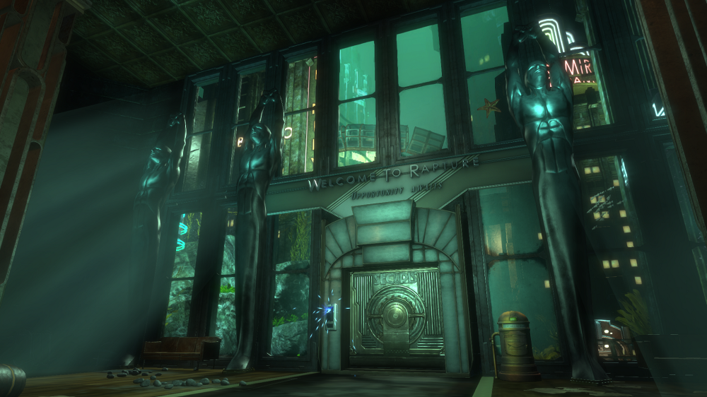 Мир этой серии игр, как должно быть известно многим — отчасти параллельный с нашим. Действие первой BioShock разворачивается в 1960 году и приводит главного героя в подводный город Восторг. Спроектированный гениальным инженером, этот мегаполис поражает воображение игрока своей приближенностью к стилистике стимпанка. Особенно впечатляет прибытие: медленное погружение в техногенную «Атлантиду» от первого лица; проплывающие мимо обитатели морских пучин; мягкий, рассеянный водой свет… Незабываемо.