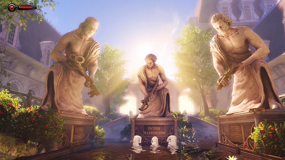 Те же эмоции рождает и возвышение к небесам в BioShock Infinite. Со дна морского в поднебесное царство, летающий город Колумбию — неплохой контраст. Поддерживаемая в непрерывном полете таинственной технологией «квантовой левитации», она даже названа в честь женского образа, олицетворяющего Соединенные Штаты Америки. Колумбия переполнена традиционными признаками своей страны-создателя, такими, как развешенные повсеместно цвета национального флага. По задумке проектировщиков, она должна была послужить демонстрацией американской исключительности.