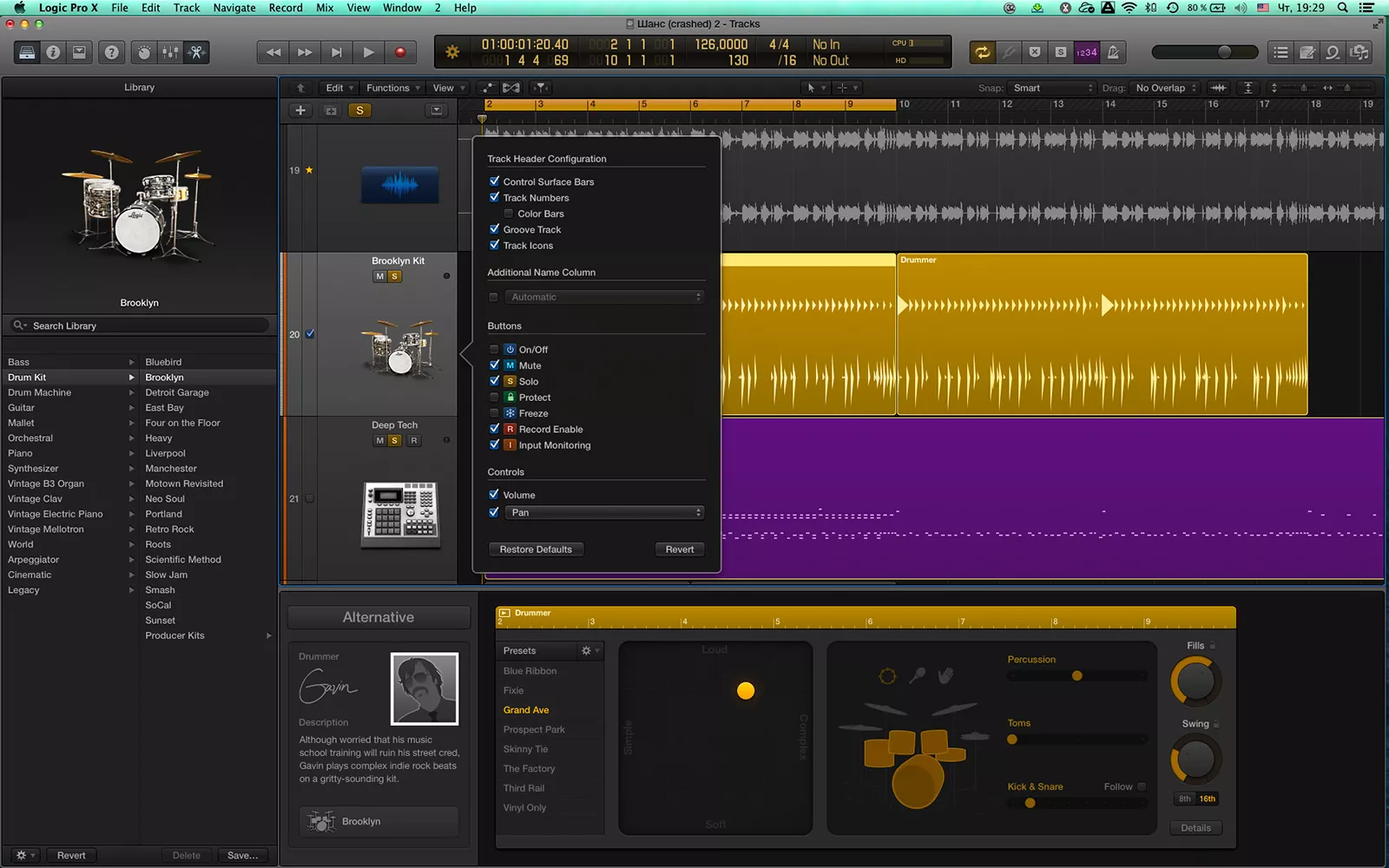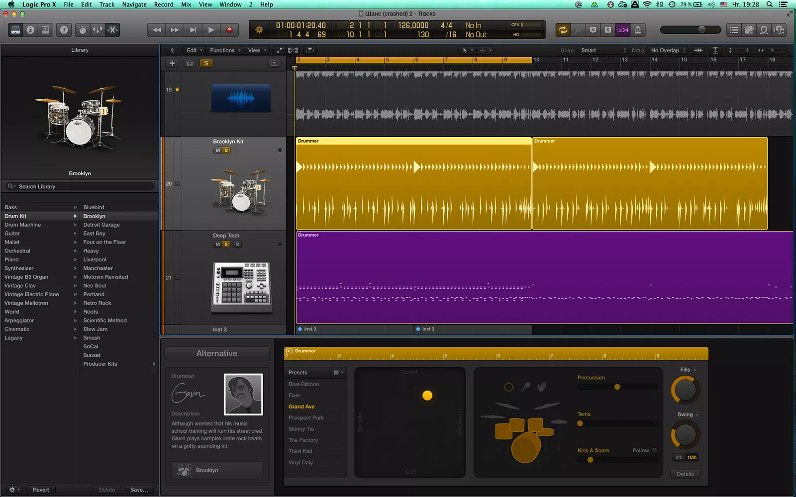 Барабаны звучат как должны звучать, они обработаны, эквализация правильная, тарелки на своих местах — не нужно это все подгонять. Потом создаешь midi-дорожку, чтобы у тебя были показаны инструменты, а не аудиоволна. После этого я редактировал дорожку так, как требовалось под аранжировку. Опытным путем понимаешь, что по midi-каналу получается тот же самый грув, который идет в Drummer. Конечно, можно и в самом драммере барабанщика контролировать, задавая ему различные параметры, но все равно тонкие акценты, например, паузы или двойные удары перед разгоном можно сделать только на midi-дорожке. Проще говоря, сам Drummer помогает очень быстро найти оригинальный loop, а потом нужно переходить к его редактированию, распределив барабаны по всему треку и убирая все лишнее, например, в демо-треке я начал с удаления перкуссии в первом квадрате.