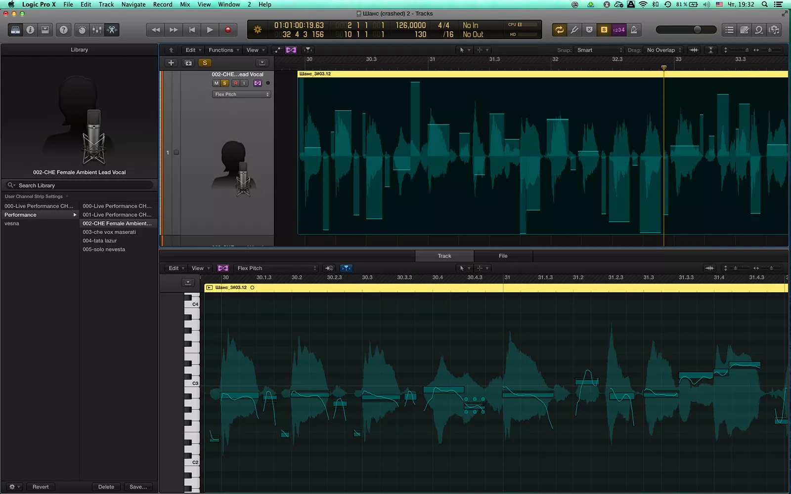 Хотел бы отдельно остановиться на новых возможностях для людей, которые занимаются голосом и его обработкой. До сих пор приходилось пользоваться Auto-Tune, который доводит голос до правильных нот, но слишком заметен из-за электронного звучания, либо Melodyne с более реалистичным результатом, но он менее прост и удобен. В новой версии Logic Pro X 10.1 инструмент Flex Pitch оказался именно тем, что я больше всего ждал от этого обновления. Я сам записываю голос, потом его редактирую. Это очень долгий и трудоемкий процесс, но теперь мы открываем Flex Pitch и видим, что все ноты уже разделены и доступны для быстрого редактирования.
