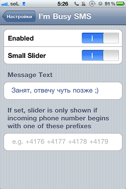 C этим твиком вы можете отклонить входящий вызов и отправить в ответ смс, уведомляющее, что вы сейчас не можете говорить, всего лишь одним слайдом на локскрине![/NEWS] Вы наверняка были в ситуации, когда, сидя на совещании, паре или за рулем, вы не могли ответить на входящий вызов, но хотели бы дать понять, что перезвоните, как только освободитесь? I'm Busy SMS позволит теперь вам это сделать!