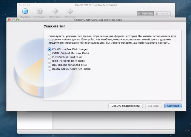 Формат диска должен быть VDI, он должен быть динамическим, и иметь размер от 15гб. Впринципе достаточно и 10гб, но лучше перестраховаться.
