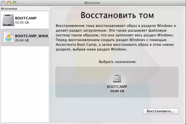 Запускаем программу WinClone, выбираем ранее смонтированный нами образ системы, и нажимаем кнопку "Образ" ![]() На дальнейшем шаге кнопка "image" ![]() И удаляем все лишние файлы из образа системы ![]() И сохраняем. Программа выполнит нужные ей операции и у вас появится образ системы с расширением .winclone Теперь осталось восстановить полученный образ на созданный в самом начале раздел BOOTCAMP ![]() |
